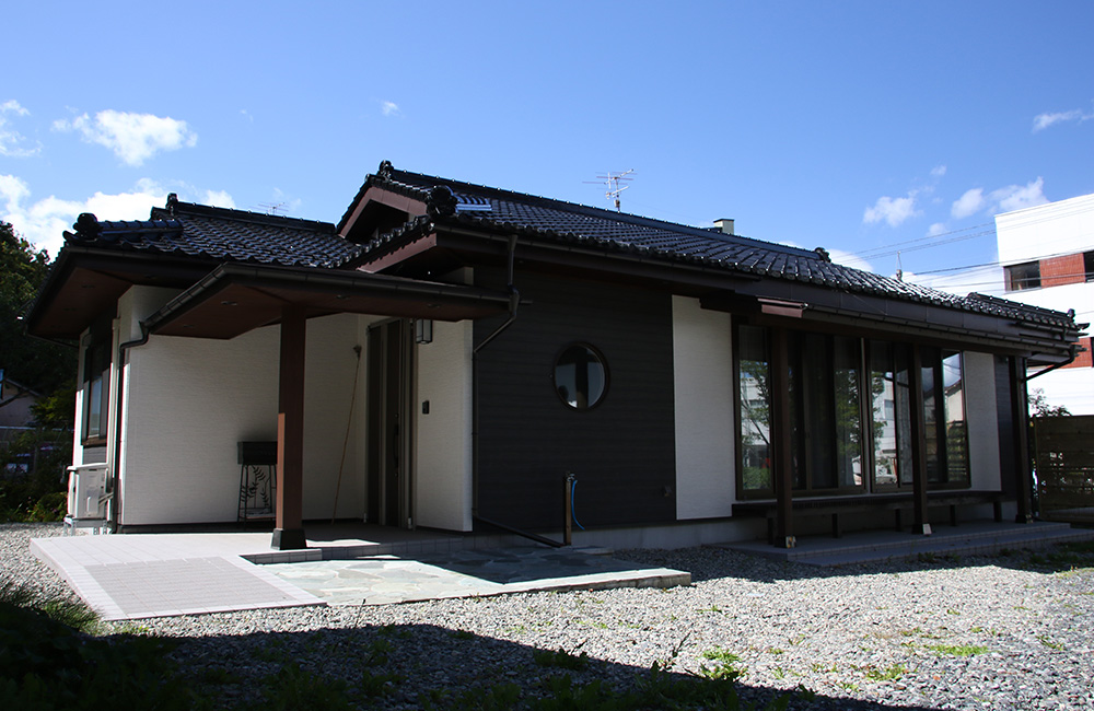落ち着きのなかにも丸窓など現代的な要素も取り入れ、遠野の町並みにひっそりとなじむ家。
